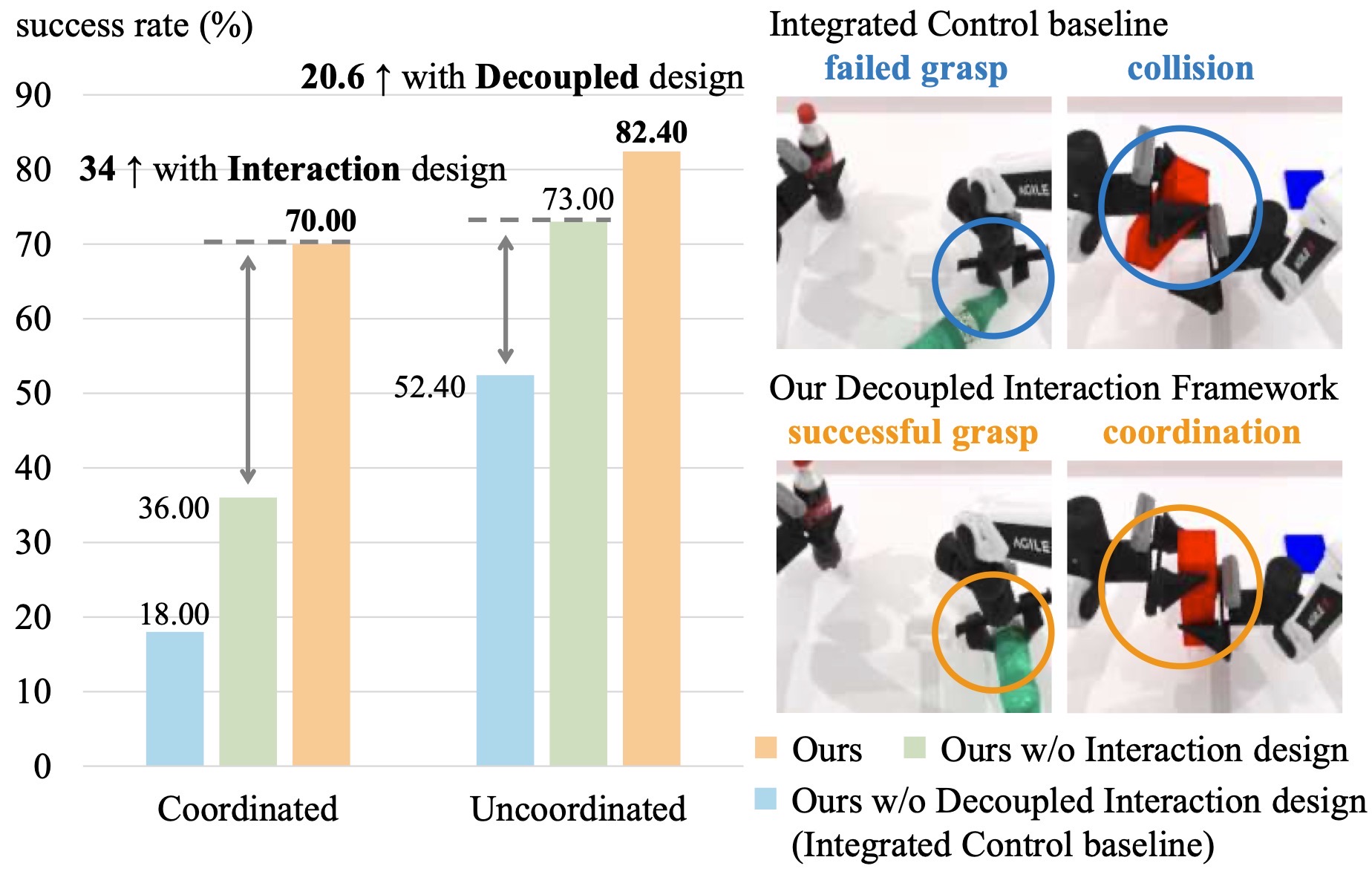 A decoupled interaction framework that categorizes bimanual manipulation tasks into non-collaborative and collaborative types, and performs both effectively.
