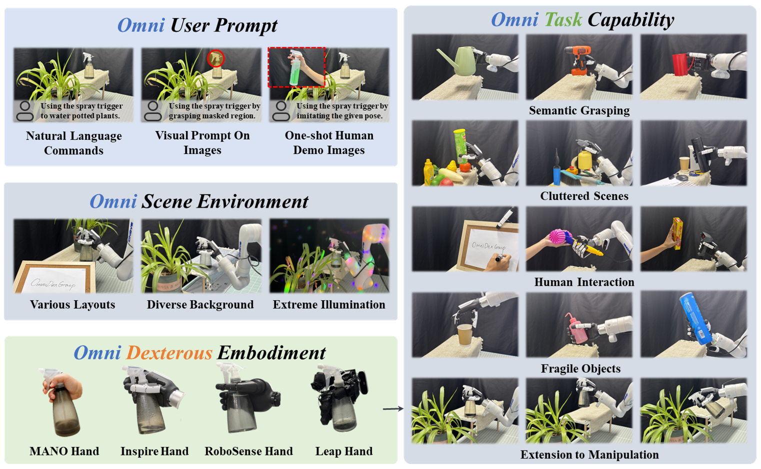 A generalizable dexterous framework that achieves omni-capabilities in user prompting, dexterous embodiment, and grasping tasks.
